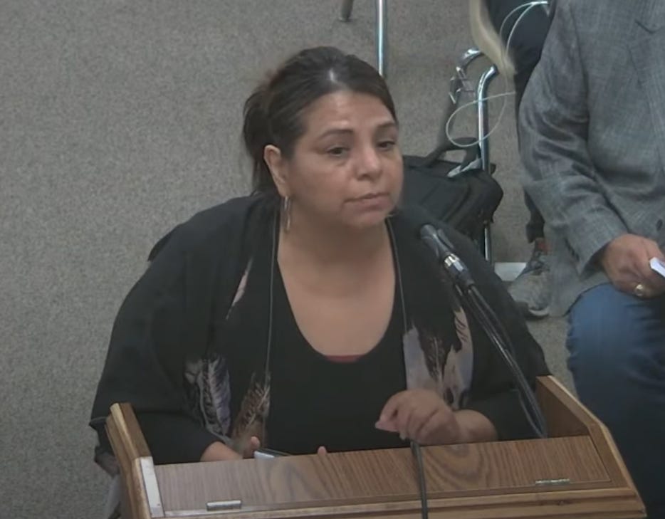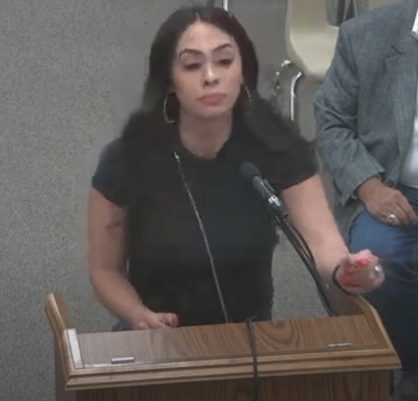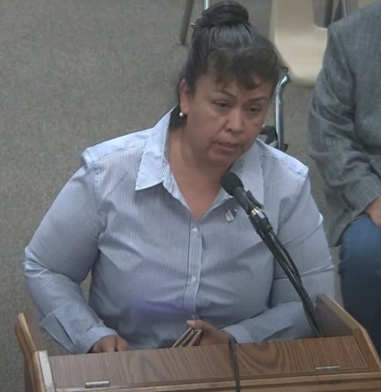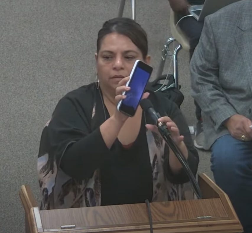 When Esther Zapata, grandmother of the victim steps up to the microphone, she attempts to play audio from her phone. You can hear a board member, presumably Dr. Sanchez whispering to BOE President Soto, “She’s welcome to speak, but she can’t put somebody else on the microphone.” Soto then stops Zapata and says, “Okay, no. You signed up to speak not an individual on the phone so…”