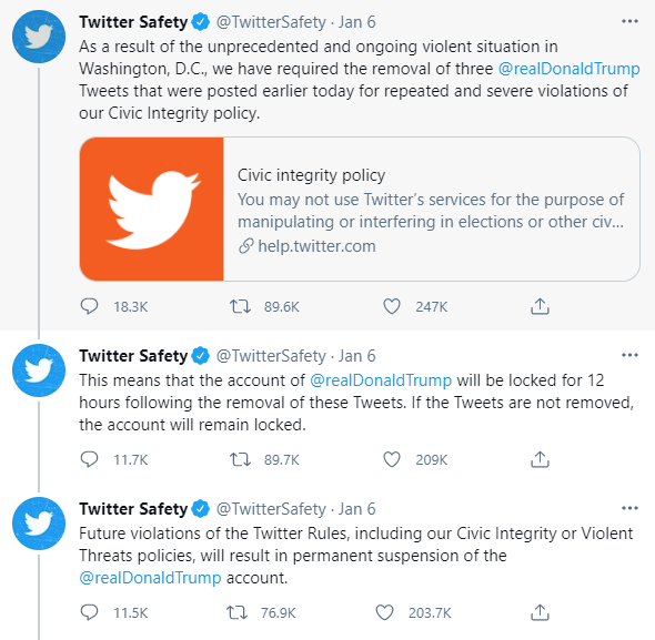 Twitter Support explained their decision in a series of tweets on January 6th and warned that if Trump didn't remove the three tweets in question, his account would remain locked, adding a threat of permanent suspension if the account continued to violate Twitter Rules or their Civic Integrity or Violent Threats policies: