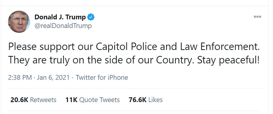 At 2:38 pm on January 6th, the day that Trump told his followers to remember forever, the President asked for the support of law enforcement and Capitol police and urged those attending the protest to "Stay peaceful!"