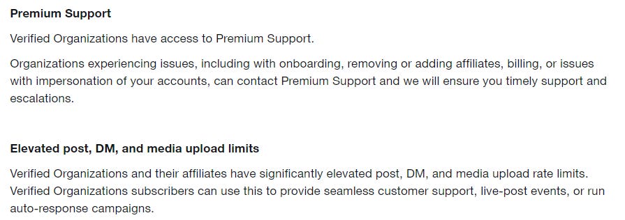 “Verified Organizations and their affiliates have significantly elevated post, DM, and media upload rate limits. Verified Organizations subscribers can use this to provide seamless customer support, live-post events, or run auto-response campaigns.”
