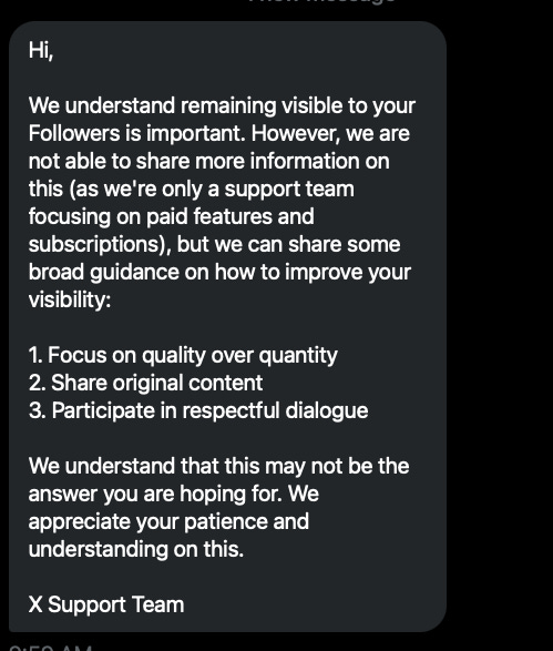 “What you need to do is go back through the last several months of posts on your account and delete all critiques of 𝕏 and/or Elon. This would include inquiries into what’s happening on your account or discussions around censorship, view count, or suppression on the platform. Delete all of those. You will want to instead post positively about 𝕏, SpaceX, Tesla, and Elon. Give it a few days after doing this and review your engagement. You should see a small boost after 4 days, more after 7, and by 28 you should be leveled out to an even playing field.”